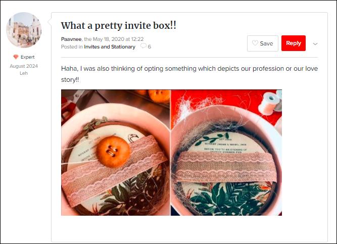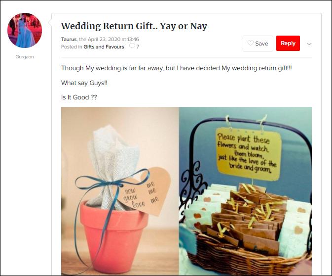 Everything’s well unless it comes to gifts and favours at a wedding ceremony.. Surprisingly, guests look forward to enchanting thank you gifts. From selecting on a perfect #ShaadiKaLifafa to the most scrumptious sweet box everything counts in the checklist. If you are perplexed on what to gift to the guests and on which ceremony, this category on WeddingWire India community is a perfect pick for you. What do you need to know? Just shoot a post and ask our experts!