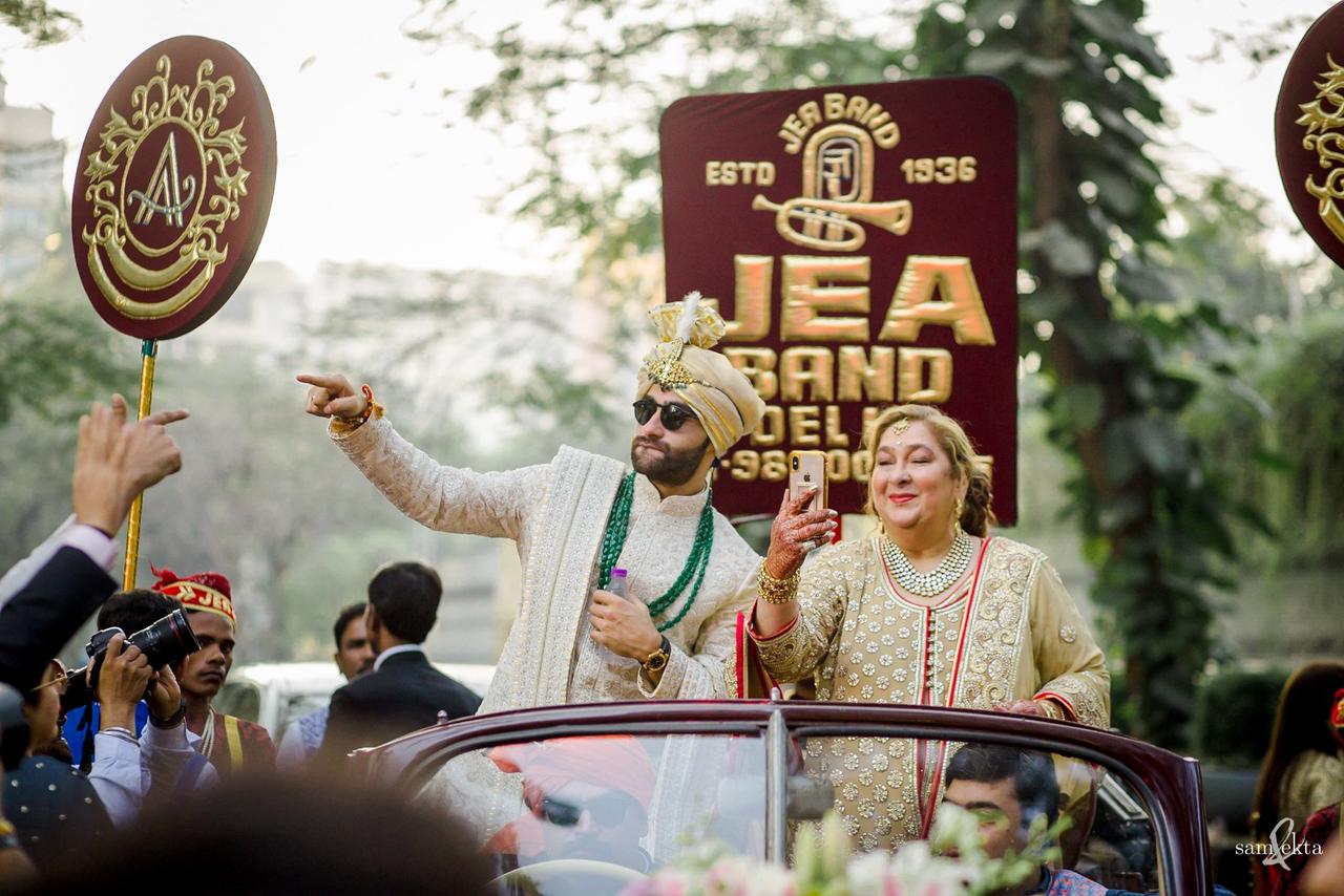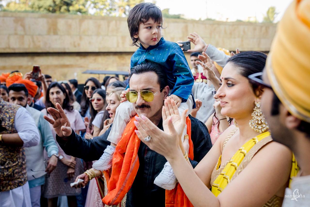 This is exactly how a Bollywood Baraat should look like! All the who's who of B-town made an ecstatic entrance and it was everything a true blue Punjabi wedding Baraat can be - the band baja, dancing on the dhol and nagadas. Armaan Jain's ivory sherwani by Abu Jani and Sandeep Khosla, with intricate work was accessorised with an emerald green Satlada Haar and a golden Safa. The Baraat was star-studded with Kareena Kapoor Khan wearing a cheerful yellow Nikasha drape and metallic gold blouse. Lolo, on the other hand, picked a pretty in pink saree by Raw Mango and danced their way into the Shaadi in full gusto!