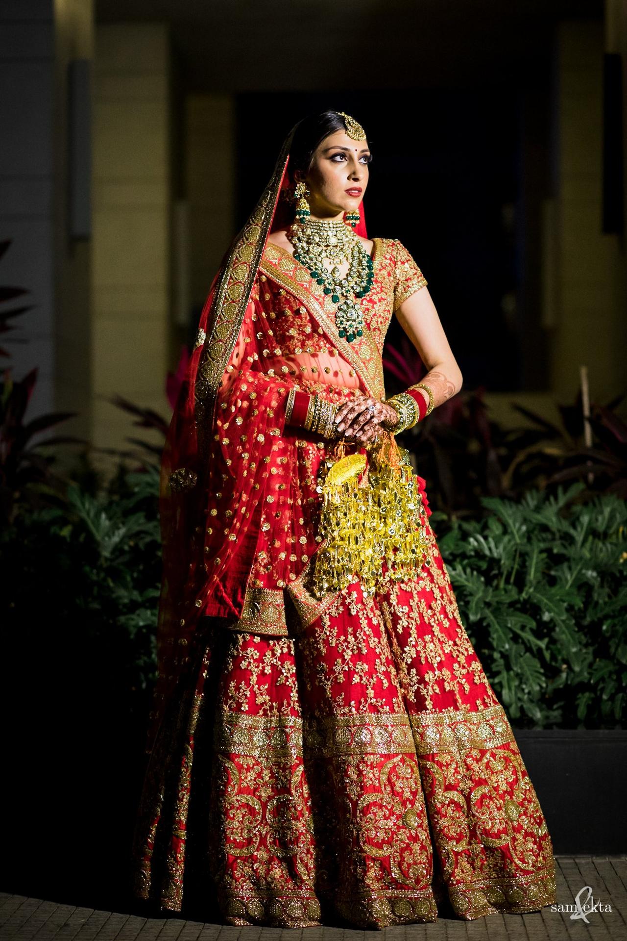 The pastel pink roses in the Phoolon ki Chadar only confirms the undeniable inclination towards pastels and the renaissance of pastels in the big fat weddings. The ever-gorgeous bride, Anissa, wore a Sabyasachi lehenga and she makes for an absolutely gorgeous Sabya bride. The diamond choker and the heavy Kundan haar studded with emeralds, with a matching Maang Tikka and Jhumkas make her look ethereal.