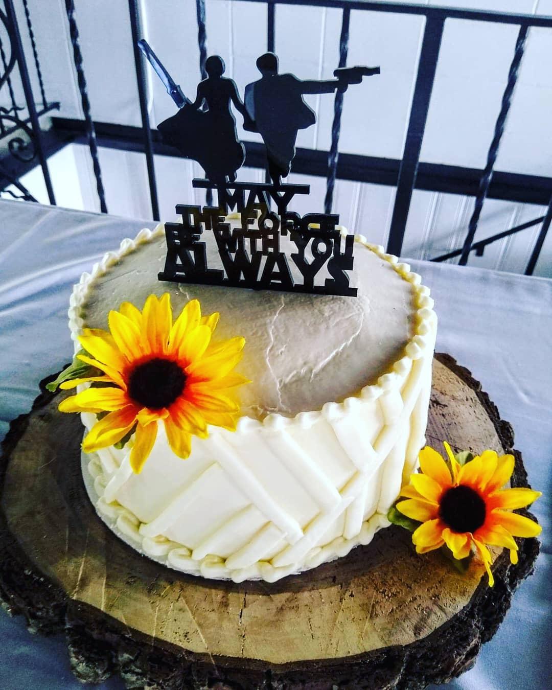 For the next entry on our list of best cake images, we have this star wars themed cake with an element of humour which will make for the perfect wedding cake for the star wars geek couple. Similarly, you can make the design of your cake centred around the books, films or TV shows that the two of you are obsessed over.