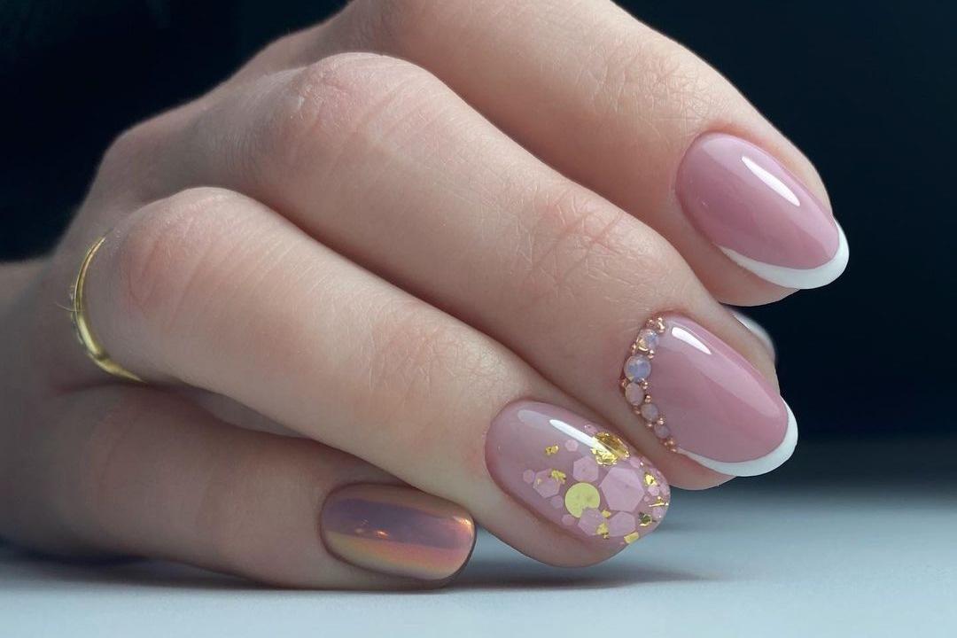 Mix holographic gold glitter with metallics and a contrasting colour like pink or nude and you’ll have a unique-looking bridal manicure ready for your big day!