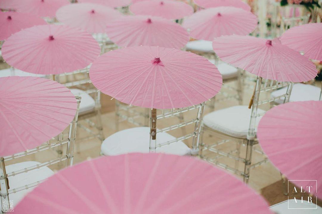 Ghost chairs were initially designed in two designs - Louis Ghost Chair and Victoria Ghost Chair. They were rightly named after their monarchs owing to the fact that the inspiration was derived from these royal chairs. However, now there is a variety of ghost chairs available and one of them is this stylised version - Chiavari ghost chair. To add to the fun and aesthetic, you could add elements like tassels, wagasas (Patio umbrellas) going with the umbrella decor trend, lace, ribbon or even flowers.