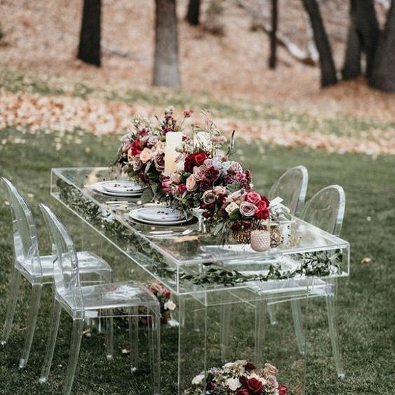 To top it off, when the light reflects from these chairs, they actually add glitter and glam to your venue while keeping it subtle during the day time. They are colourless and that means you can pick them with a pink table cloth or a sequin table runner without having to worry if they will complement each other. A transparent table just complements the ambience.