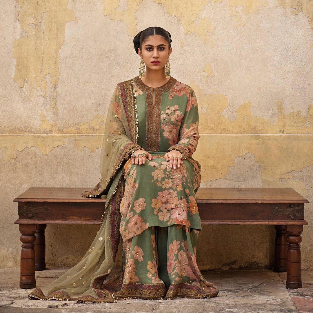 The first lehenga suit is an earthy green colour with rusty flower prints spread unevenly throughout. You can wear this to a wedding, someone’s Mehndi ceremony and anywhere your heart desires!