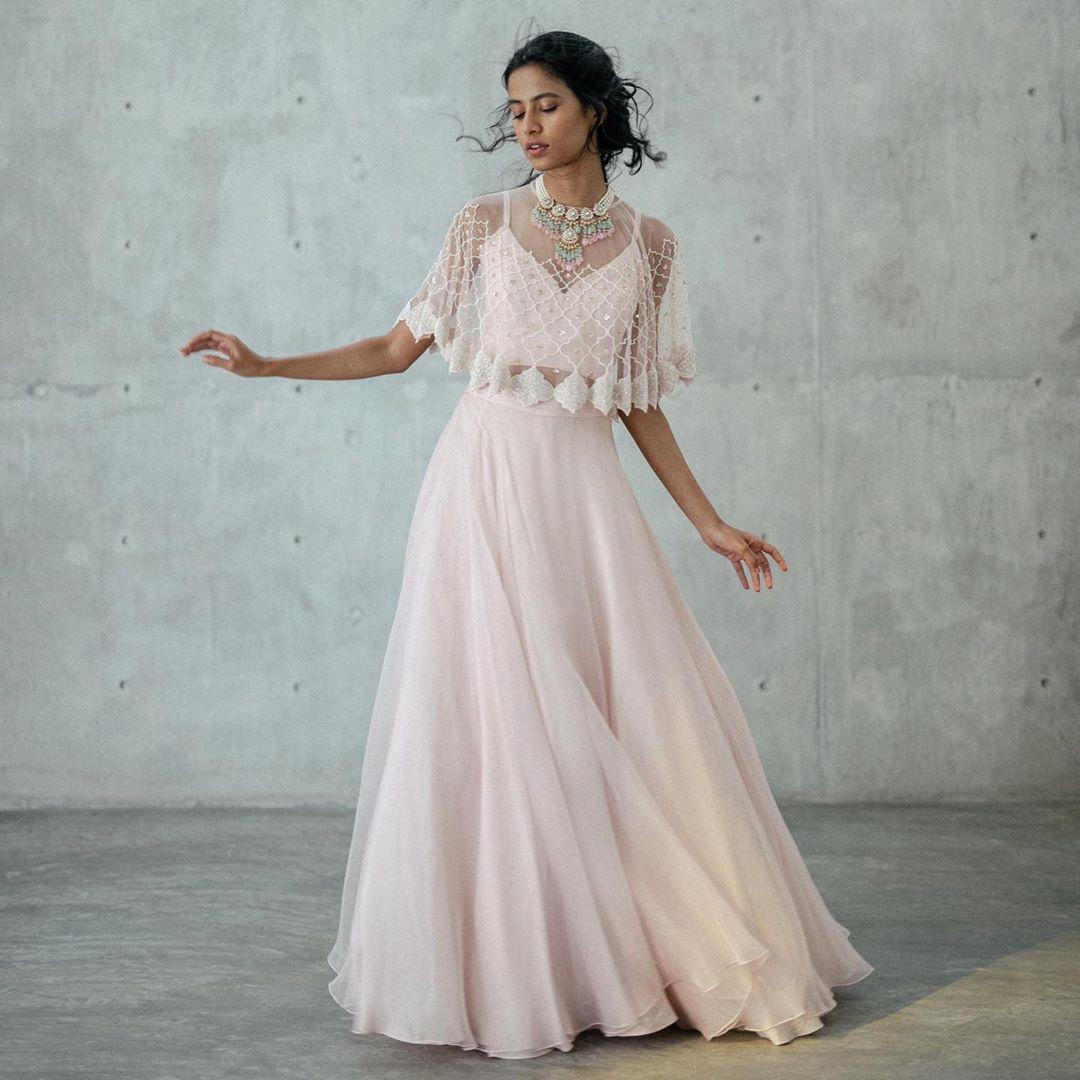 Mishru is another brand that has developed beautiful collections that introduce the modern in rich traditional ensembles. This homegrown brand based out of Telangana has showcased this organza lehenga picked from the pastel palette and we are crushing over how the simplicity of the attire makes it so refined. The cape blouse with intricate jaali designs makes this piece an exceptional one.