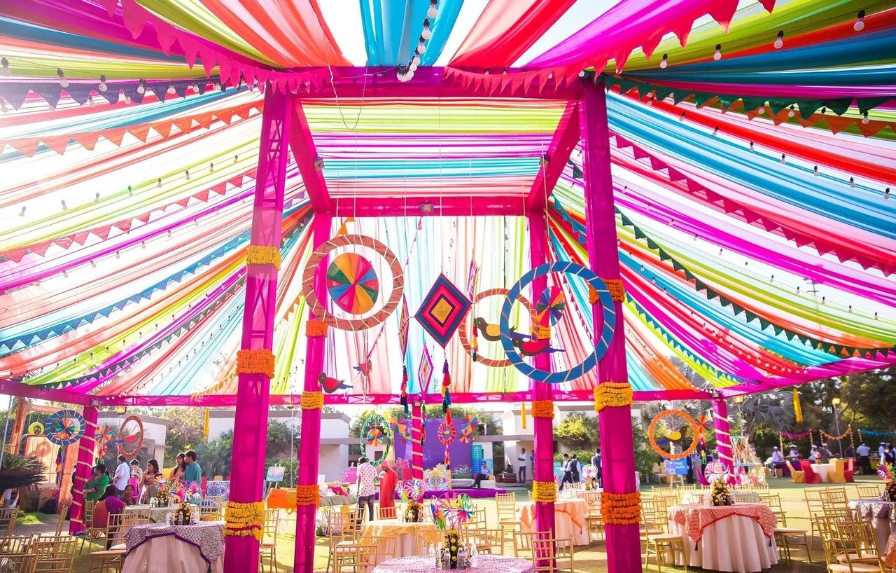 We have seen plenty of pink and red decors by wedding planners in Delhi, but we have rarely come across an all yellow decor for a day wedding function. This colourfully creative production by the team of Eventsia looked like an ode to the famous kites festival of Gujarat.