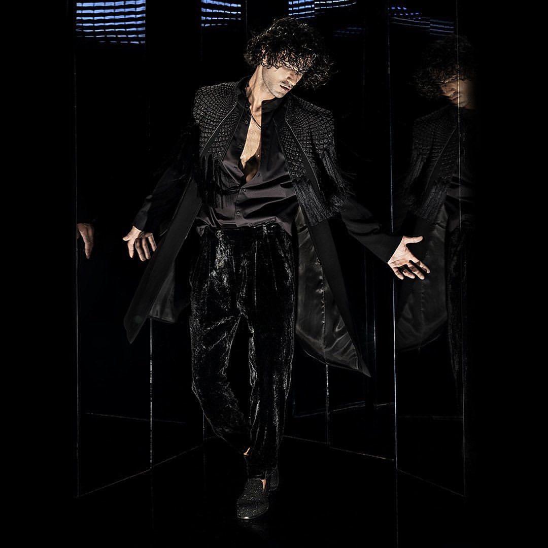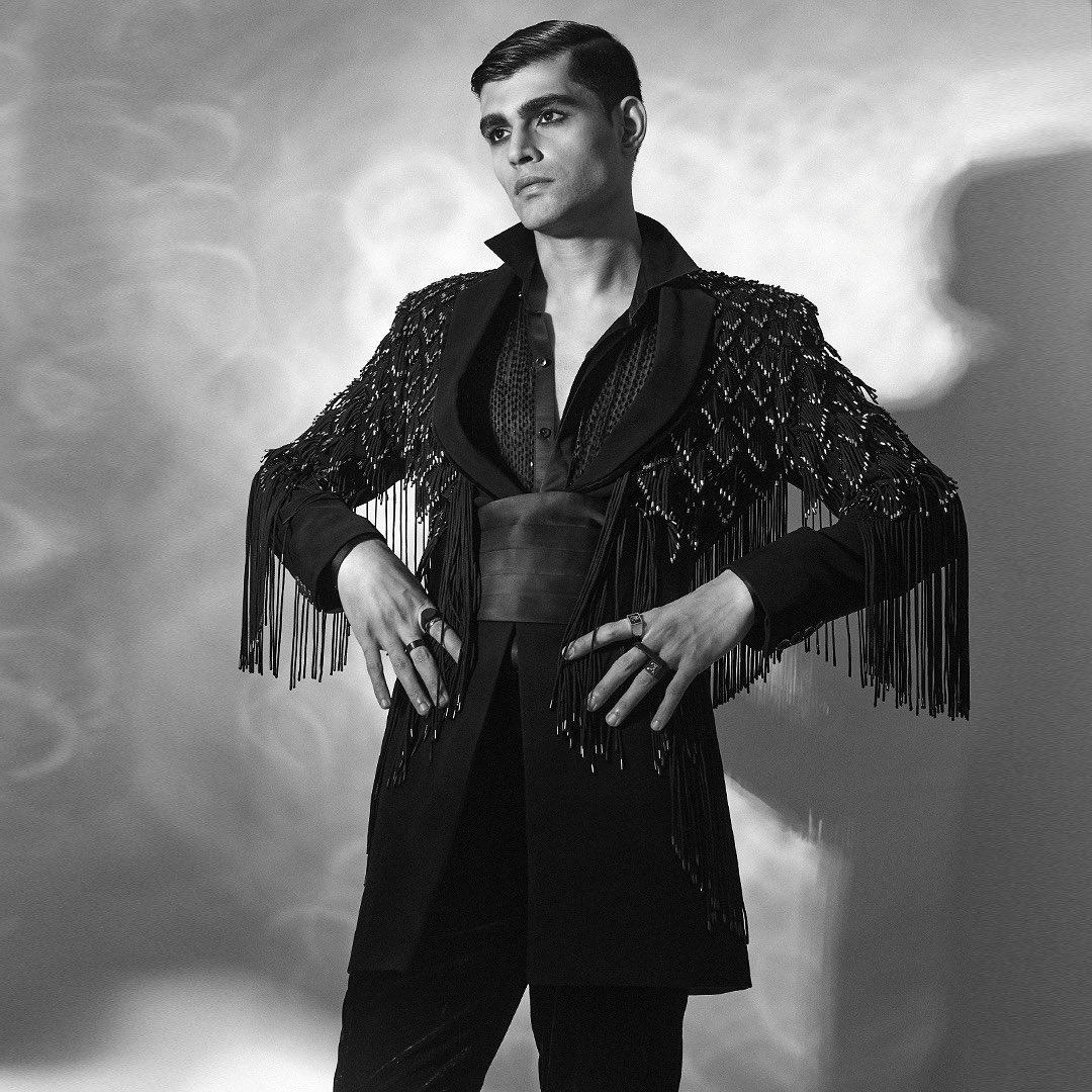 The velvet tuxedo in black with embellished detailing is a great western dress design image for men out there.