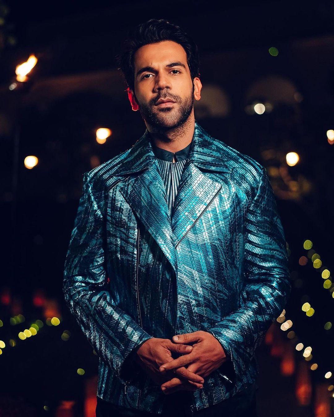 Flaunting a custom made hand marbled and woven biker jacket for Rajkumar Rao's wedding festivities, this blue western dress designs for men is sure to make you look handsome.