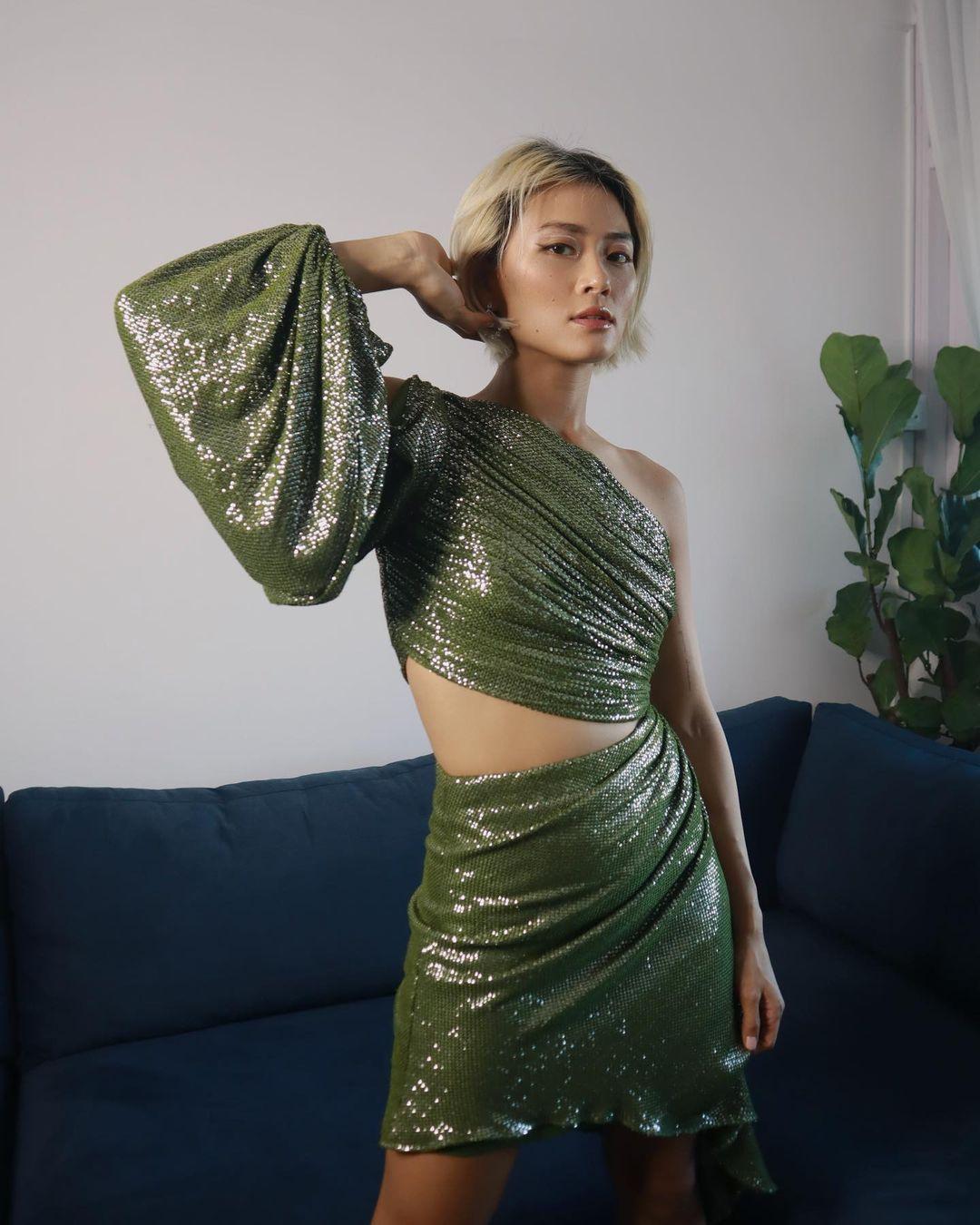 Paired with a high-low skirt with the green cinched off-shoulder top, this western dress design image as seen on Manushi Chillar is a class apart!